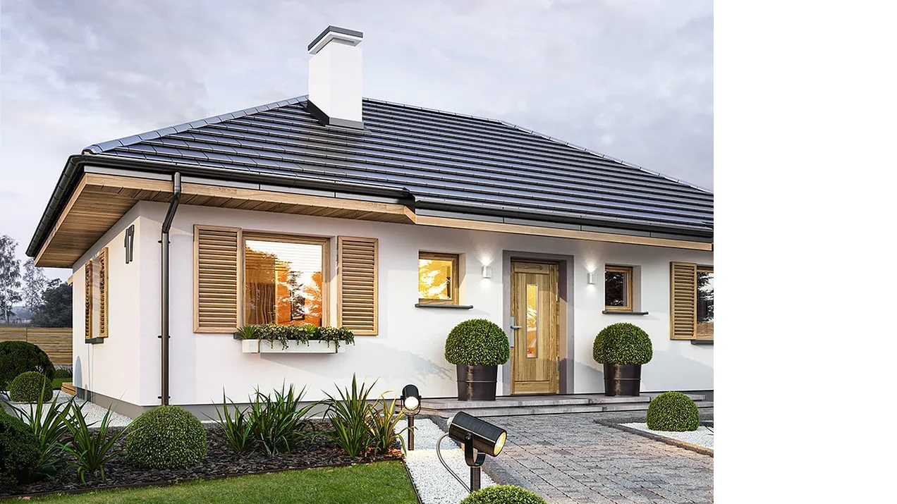Parterowy dom jednorodzinny z dwustanowiskowym garażem z możliwością adaptacji poddasza do celów mieszkalnych.